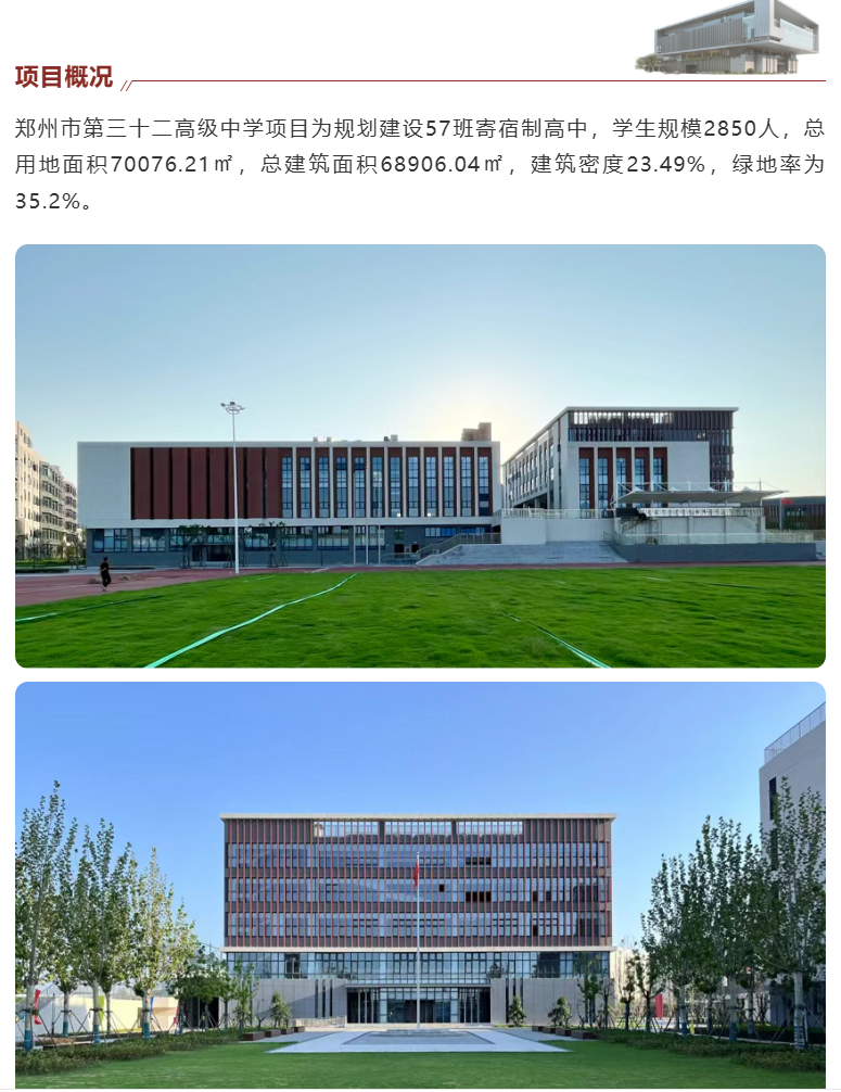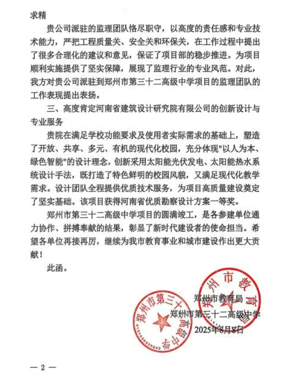 近日,由鄭州路橋建設(shè)投資集團有限公司代建,由河南省院承擔設(shè)計工作的鄭州市第三十二高級中學項目圓滿竣工并順利通過驗收。該項目自交付以來,憑借卓越的設(shè)計品質(zhì),獲得了鄭州市教育局及校方的高度評價與一致認可。作為鄭州市重點教育工程,該校將于今年秋季正式投入使用,屆時將迎來首批入學新生。該項目的成功落成,不僅標志著鄭州市教育事業(yè)發(fā)展邁上新臺階,更有效優(yōu)化了二七區(qū)教育資源配置,為二七區(qū)教育現(xiàn)代化進程注入了強勁動力。