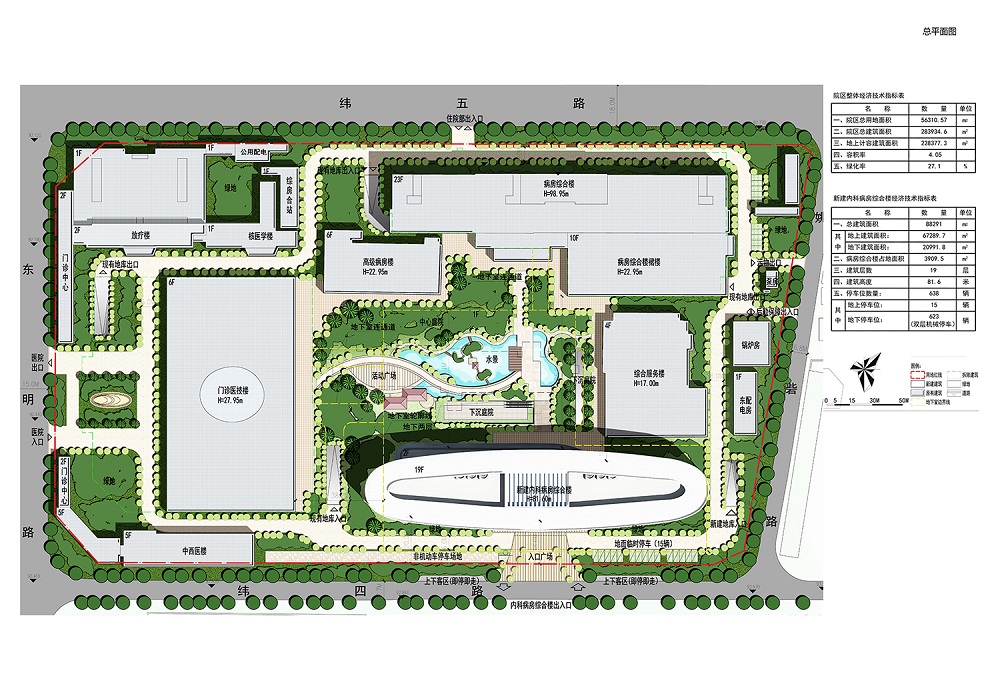 河南省腫瘤醫(yī)院位于鄭州市金水區(qū),由緯五路、緯四路、東明路、姚砦路圍合而成,距離地鐵1號線燕莊站約800米,交通便利,周邊配套設(shè)施齊備。新建內(nèi)科病房綜合樓位于腫瘤醫(yī)院院內(nèi)南側(cè),用地現(xiàn)狀為綠化廣場及待待拆除乳腺病房樓,主要功能為公共服務(wù)及部分醫(yī)技科室,1000張標(biāo)準(zhǔn)病房以及GMP實(shí)驗(yàn)室、研究生教學(xué)、實(shí)驗(yàn)用房等內(nèi)部使用功能。新建內(nèi)科病房綜合樓建筑面積88291平方米,其中地上建筑面積67289平方米,地下建筑面積20992平方米,地上19層,地下2層。
