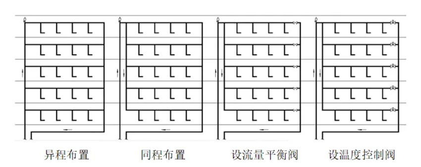供回水管網(wǎng)同程布置:各層熱水干管管長(zhǎng)、不變徑情況下,通過(guò)調(diào)整回水管閥門(mén)開(kāi)啟度,易保證各層橫管內(nèi)的水循環(huán),在熱水系統(tǒng)中經(jīng)常采用。