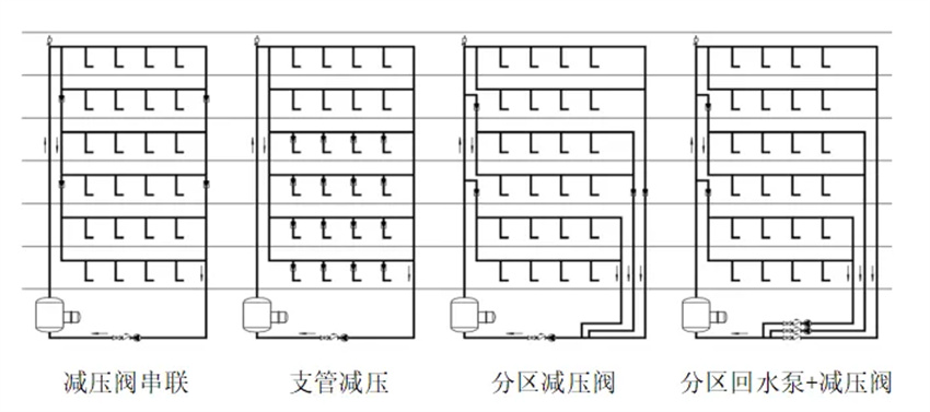 適當(dāng)?shù)墓┧畨毫δ芙o使用者帶來(lái)良好的用水體驗(yàn),同時(shí)也能降低管網(wǎng)及附件的承壓,避免不必要的水量浪費(fèi),減少日常檢修及維護(hù)成本。為減少熱水制換熱設(shè)備數(shù)量,保證用水點(diǎn)出水壓力穩(wěn)定,熱水系統(tǒng)通常采用在供水管網(wǎng)上設(shè)置減壓閥組的方式來(lái)對(duì)樓層水壓進(jìn)行控制。設(shè)計(jì)經(jīng)常采用的減壓閥組及循環(huán)泵組設(shè)置方案有以下幾種: