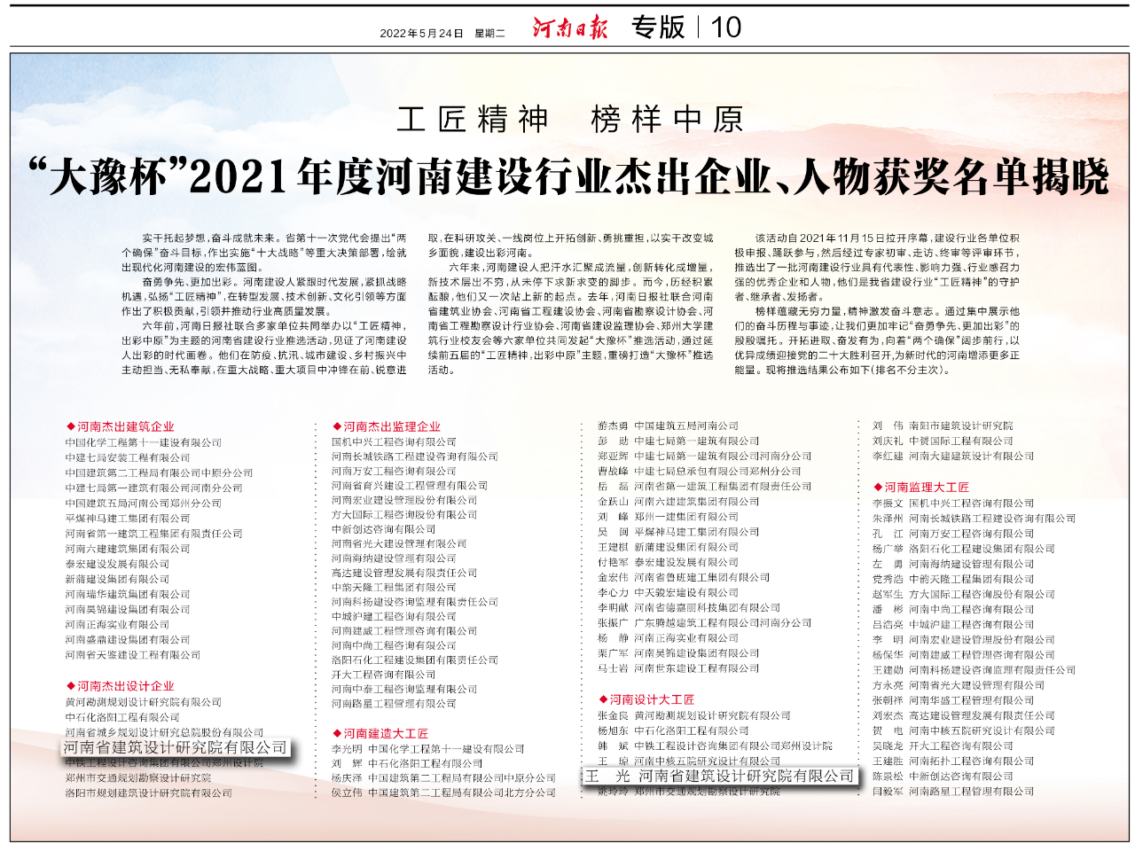 該活動(dòng)自2021年11月15日拉開序幕,經(jīng)過專家初審、走訪、終審等評(píng)審環(huán)節(jié),推選出了一批河南建設(shè)行業(yè)具有代表性、影響力強(qiáng)、行業(yè)感召力強(qiáng)的優(yōu)秀企業(yè)和人物。河南省建筑設(shè)計(jì)研究院有限公司榮獲“大豫杯”2021年度河南杰出設(shè)計(jì)企業(yè),公司副總建筑師王光榮獲河南設(shè)計(jì)大工匠稱號(hào)。