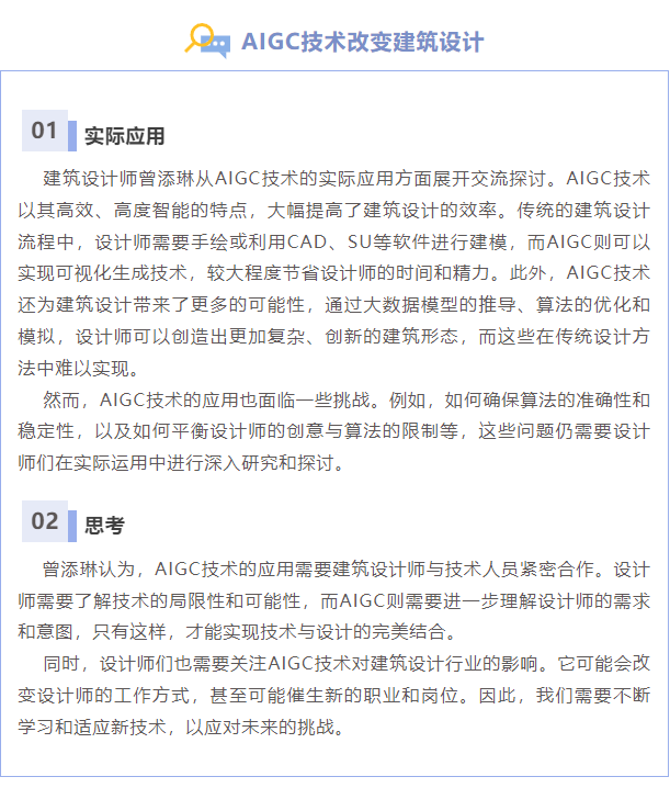 本次分享會(huì)從不同維度詳細(xì)地介紹了AIGC技術(shù)在建筑設(shè)計(jì)工作中的運(yùn)用,為設(shè)計(jì)工作提供了可探討學(xué)習(xí)的方向。在未來的工作中,河南省院將繼續(xù)深入研究和應(yīng)用AIGC技術(shù),努力探索技術(shù)與設(shè)計(jì)的最佳結(jié)合點(diǎn)。同時(shí)我們也將與更多的同行交流和合作,共同推動(dòng)建筑設(shè)計(jì)行業(yè)的發(fā)展和創(chuàng)新。