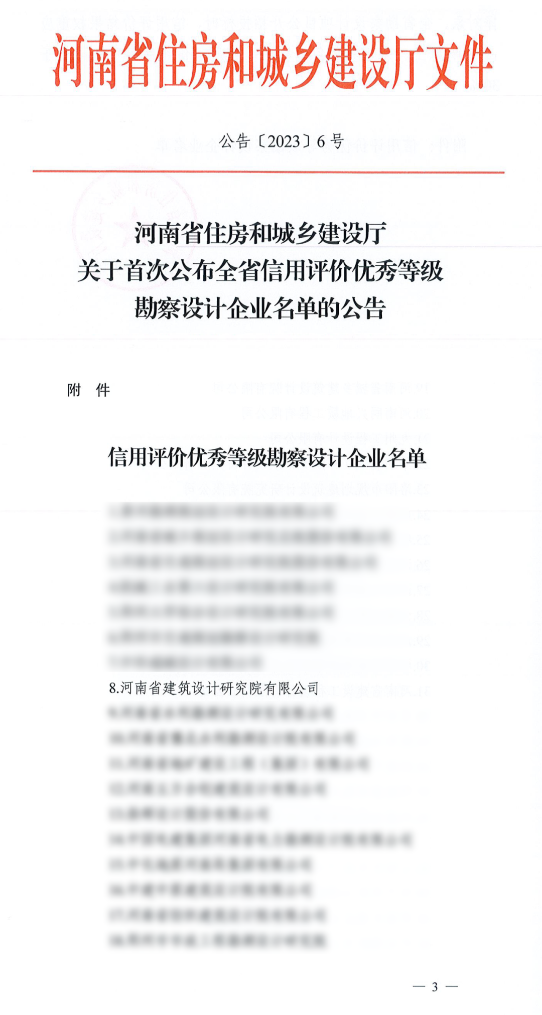 2023年2月10日,河南省住房和城鄉(xiāng)建設廳發(fā)布〔2023〕6號公告,首次公布全省信用評價優(yōu)秀等級勘察設計企業(yè)名單,河南省建筑設計研究院有限公司榮膺首批信用評價優(yōu)秀等級企業(yè),入選企業(yè)相關(guān)信息可在河南省建筑市場監(jiān)管公共服務平臺查詢。