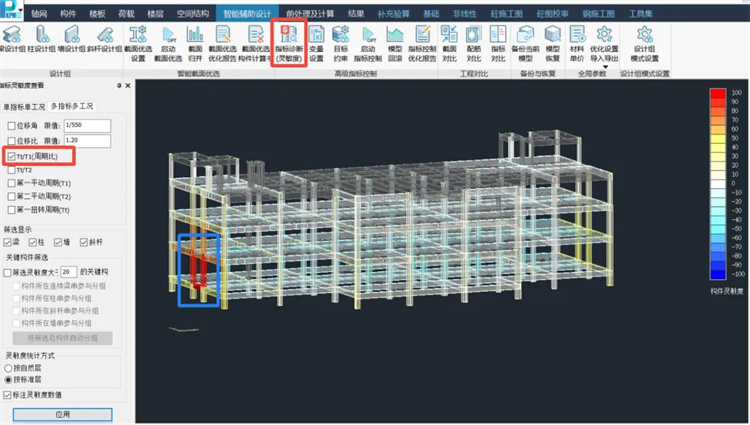 如圖4所示,經(jīng)過靈敏度分析,程序非??焖僬业搅藢?duì)于整體指標(biāo)影響至關(guān)重要的構(gòu)件,本次僅挑選靈敏度數(shù)值為100的框架梁進(jìn)行調(diào)整。由于1層是拉梁層,梁截面調(diào)整空間較大,原始梁截面為350x600,先嘗試調(diào)整為350x900,計(jì)算后周期比為0.9013,仍超限;再次調(diào)整梁截面為400x1000,計(jì)算后周期比為0.898,調(diào)整通過。單次模型計(jì)算耗時(shí)約2min,累計(jì)耗時(shí)5min完成超限指標(biāo)調(diào)整通過。