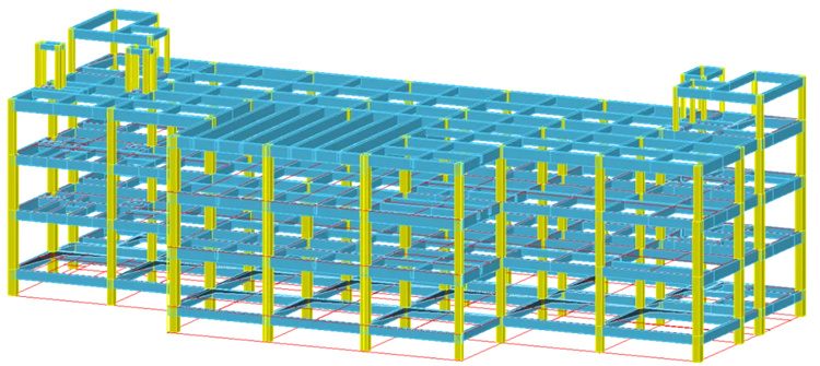 某多層鋼筋混凝土框架結(jié)構(gòu)體檢樓,抗震設(shè)防烈度6度,設(shè)計(jì)基本地震加速度峰值為0.05g,設(shè)計(jì)地震分組第一組,Ⅱ類場(chǎng)地,Tg=0.35s,B類地面粗糙度;地上3層,建筑高度13.2m,主要層高4.5m、4.2m、4.2m,長56.2m,寬18.2m;設(shè)計(jì)工作年限50年,基本風(fēng)壓(50年一遇)為0.40kN/m2,建筑安全等級(jí)為一級(jí),屬于重點(diǎn)設(shè)防類建筑。圖1為工程結(jié)構(gòu)模型示意圖,圖2為1~3及屋面層結(jié)構(gòu)平面布置圖,小屋面不再示意。