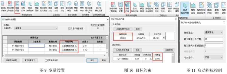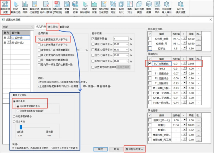 梁柱設(shè)計(jì)組分組、設(shè)計(jì)組備選截面庫均同上節(jié)所述情況設(shè)置。變量設(shè)置、目標(biāo)約束設(shè)置見圖9-圖10,周期比約束值也定為0.895。