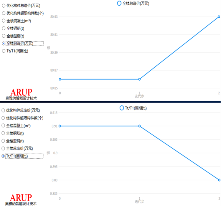 AIDV2.0實(shí)現(xiàn)了“構(gòu)件+指標(biāo)”同步雙控,截面優(yōu)化同時(shí)保證指標(biāo)滿足,即通過首創(chuàng)的獨(dú)有算法,充分考慮多種因素,確保優(yōu)化后的截面能使重要指標(biāo)(位移、周期、剛度等)保持在合理范圍內(nèi),達(dá)到最優(yōu)造價(jià)消滅超限的同時(shí),減少因指標(biāo)問題導(dǎo)致的設(shè)計(jì)返工,提高設(shè)計(jì)效率。算法深度優(yōu)化后,迭代次數(shù)降至個(gè)位數(shù),同時(shí)降低對(duì)設(shè)計(jì)組劃分的依賴。常規(guī)項(xiàng)目單模塊即可完成優(yōu)化,高級(jí)指標(biāo)模塊仍保留專業(yè)調(diào)控功能。