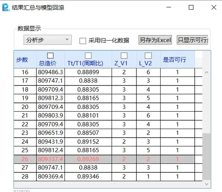 1)采用AIDV2.0版本程序進(jìn)行整體指標(biāo)超限調(diào)整時(shí),智能截面優(yōu)選功能中“構(gòu)件+指標(biāo)”同步雙控功能相對(duì)于單獨(dú)采用AIDV1.0版本高級(jí)指標(biāo)控制功能可大幅提高優(yōu)化效率。