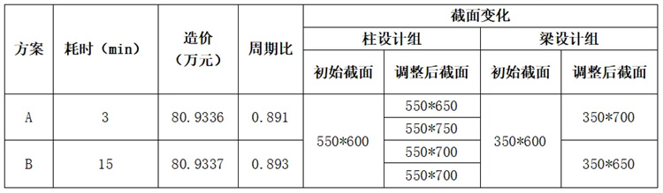采用AIDV2.0智能截面優(yōu)選功能自動(dòng)調(diào)整超限指標(biāo)通過為方案A,采用高級(jí)指標(biāo)控制功能自動(dòng)調(diào)整超限指標(biāo)通過為方案B。不同方案優(yōu)化效果對(duì)比見表1,可以看到AID2.0優(yōu)化效率提升了400%,優(yōu)化效果中造價(jià)和周期比指標(biāo)相對(duì)也更優(yōu)一些。
