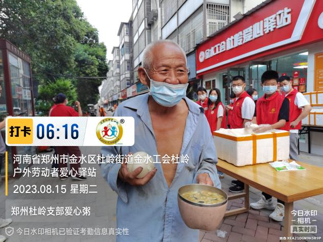 大家各司其職,動作迅速,井然有序的完成了擺放桌椅板凳、清潔消毒、清理垃圾等發(fā)放餐食前的準(zhǔn)備工作。與此同時(shí),伴隨著朝陽的到來,粥屋外就餐人員默默地等待,他們大多為附近的環(huán)衛(wèi)師傅、流浪者、農(nóng)民工以及附近的老年居民等,他們安靜有序地排著長長的隊(duì)伍,從粥屋門口一直排到十字路口。志愿者們?yōu)榱私o等待的人們奉上一碗滿滿的熱湯飯,各自加快了手上的動作,大家用愛匯聚成一股股紅色的暖流,溫暖著現(xiàn)場的每一個(gè)人。