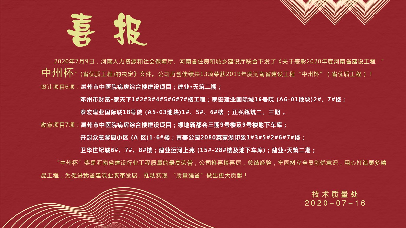 2020年7月9日,河南人力資源和社會保障廳、河南省住房和城鄉(xiāng)建設(shè)廳聯(lián)合下發(fā)了《關(guān)于表彰2020年度河南省建設(shè)工程 “中州杯”(省優(yōu)質(zhì)工程)的決定》文件。公司再創(chuàng)佳績共13項榮獲2019年度河南省建設(shè)工程“中州杯”(省優(yōu)質(zhì)工程)!