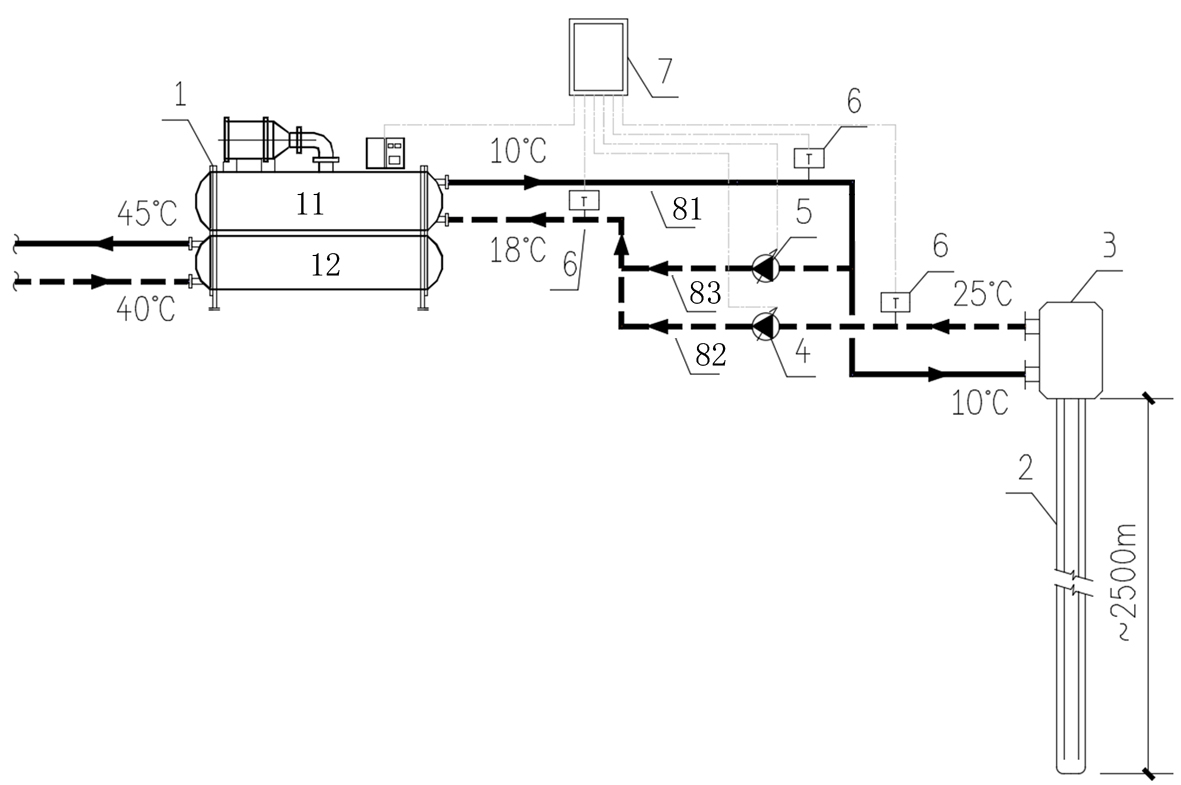 本課題示范工程研究了新型調(diào)溫技術(shù),提供一種新型中深層地?zé)岬芈窆芟到y(tǒng)的調(diào)溫系統(tǒng)。新型調(diào)溫技術(shù)將調(diào)溫結(jié)構(gòu)由電動(dòng)旁通閥,通過一個(gè)循環(huán)水泵將所有循環(huán)水整體回泵,改進(jìn)為額外設(shè)置一條獨(dú)立運(yùn)行的回水管路,并為該管路配備獨(dú)立的第二循環(huán)水泵,在開始循環(huán)時(shí),可以先由該獨(dú)立回水管路單獨(dú)運(yùn)行,保證整機(jī)可以正常運(yùn)行,之后再讓從地埋管中換得的熱水逐漸加入循環(huán),以防止因高溫保護(hù)導(dǎo)致的整機(jī)無(wú)法啟動(dòng)。見下圖: