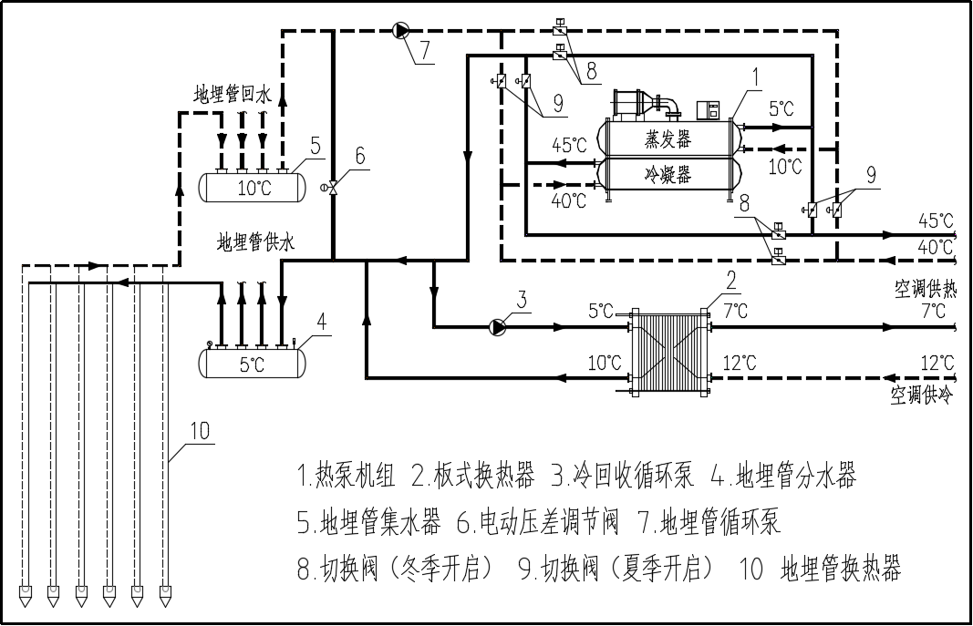 淺層地埋管熱泵系統(tǒng)冬季蒸發(fā)器側(cè)的設(shè)計(jì)溫度一般為10/5℃,是非常優(yōu)質(zhì)且穩(wěn)定的冷源。冬季供熱的同時(shí),回收利用這部分冷量,即能減少?gòu)耐寥乐蝎@取熱量,增大供熱面積,并提高系統(tǒng)效率。