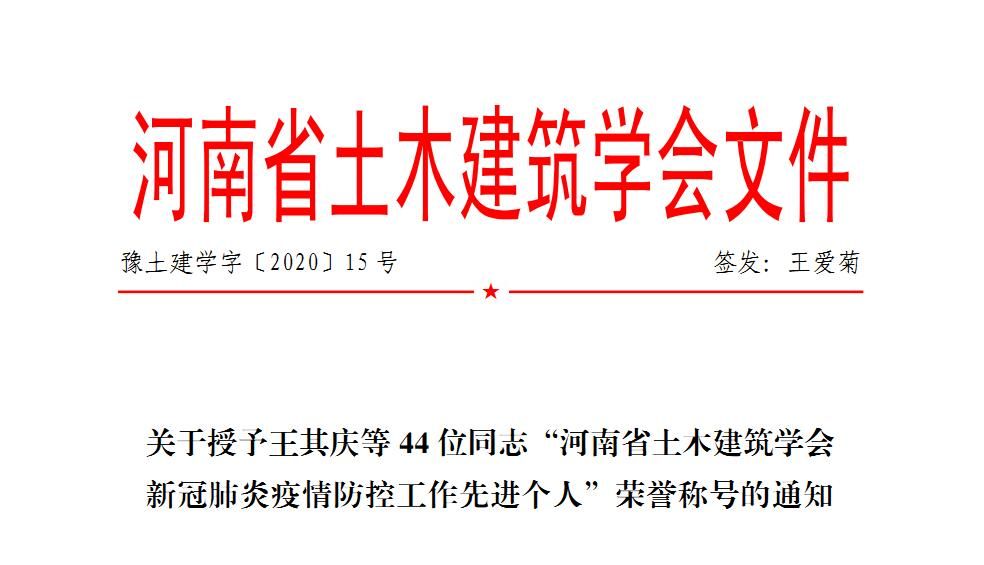 河南省土木學會 http://www.hnstmjzxh.com/newsshow.aspx?id=922 關(guān)于授予王其慶等44位同志“河南省土木建筑學會新冠肺炎疫情防控工作先進個人”榮譽稱號的通知