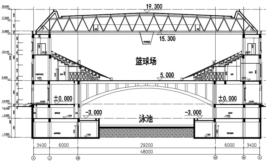 樓蓋體系:游泳池頂蓋采用現(xiàn)澆砼空腹拱架梁;籃球場屋蓋采用倒三角形立體管桁架。