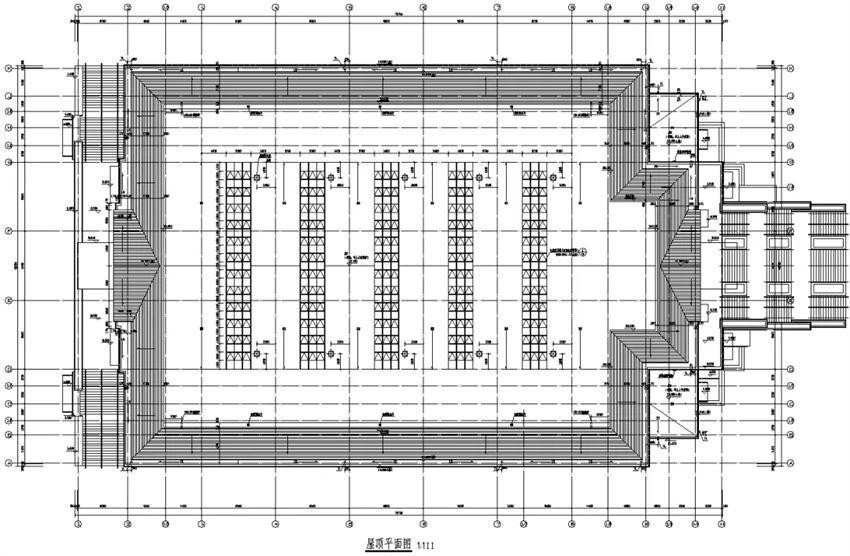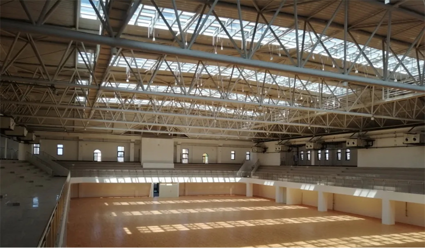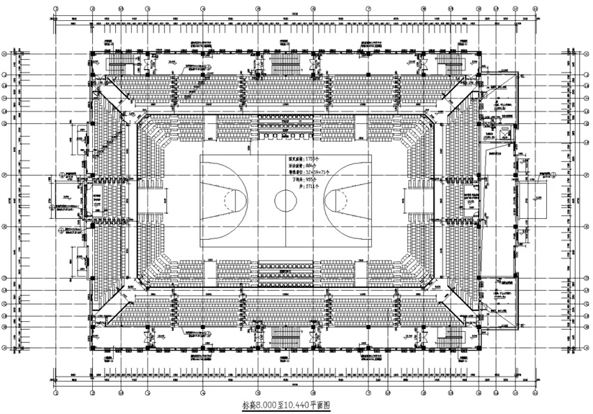 籃球館共有席位2711個,其中活動座椅884個;籃球館屋蓋長69m,寬41.2m;兩側(cè)有夾層,層高分別為5.44m和4.36m。
