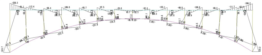豎向腹桿:間距2.1m,從跨中至兩端腹桿所受剪力逐漸減小,腹桿截面高度500(垂直拱架方向),寬度由500減小至300。