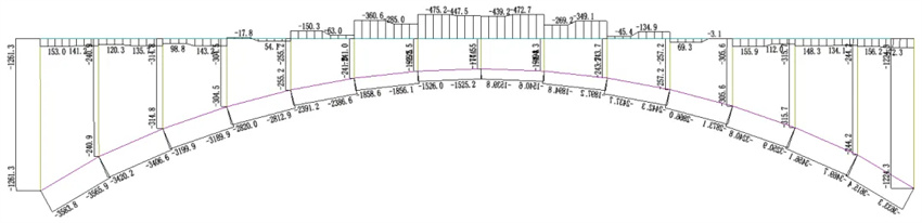 砼空腹拱架梁基本參數(shù):榀距為9m,弦桿中心線距離在兩端為5m,跨中為1m。下弦拱矢高為4m,矢跨比為1/7.3。