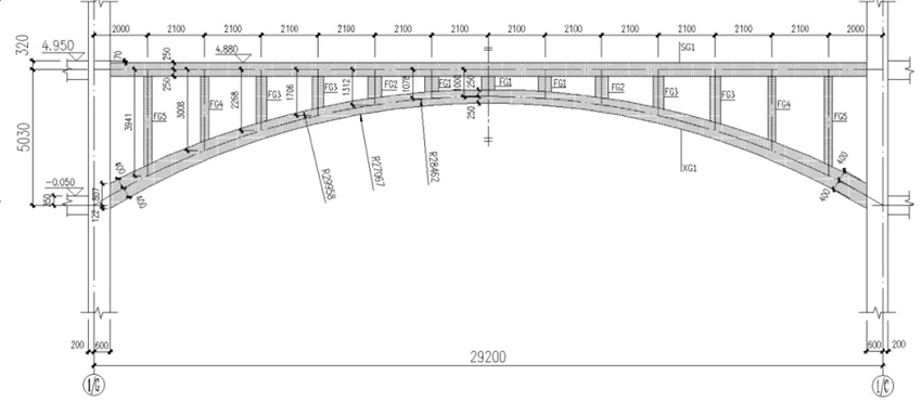 為了能較好解決上述問題,本項目中,借鑒上承式拱橋的結(jié)構(gòu)形態(tài),采用砼空腹拱架梁來實現(xiàn)29.2m的跨越。砼空腹拱架梁由下弦拱、豎向腹桿和上弦水平梁構(gòu)成,拱腳生根在下層樓層位置。