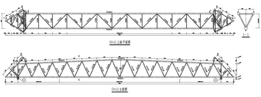 管桁架施工安裝時,應(yīng)從一端的兩榀桁架開始,待該兩榀桁架的穩(wěn)定桁架、剛系桿以及鋼拉條全部安裝完畢,并校正其垂直度、水平定位后,再逐次安裝相鄰榀桁架。