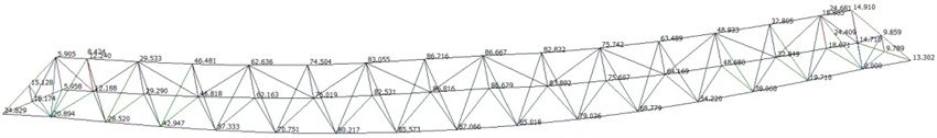 因為節(jié)點采用相貫焊接,在腹桿兩端存在一定約束,并非理想鉸接,屬于半剛性節(jié)點。故采用梁單元或桁架單元可以視情況而定,當(dāng)長徑比較小時,以采用梁單元為好。對比過幾個案例,正常情況下,兩者結(jié)果相差很小。一般規(guī)律是:腹桿采用梁單元對桿件設(shè)計偏安全,采用桿單元撓度驗算偏安全。(當(dāng)桿件長徑比不滿足《鋼規(guī)》10.1.4.2條要求時,要采用梁單元)。本項目桿件強度驗算時采用梁單元,桁架撓度驗算時采用桿單元。
