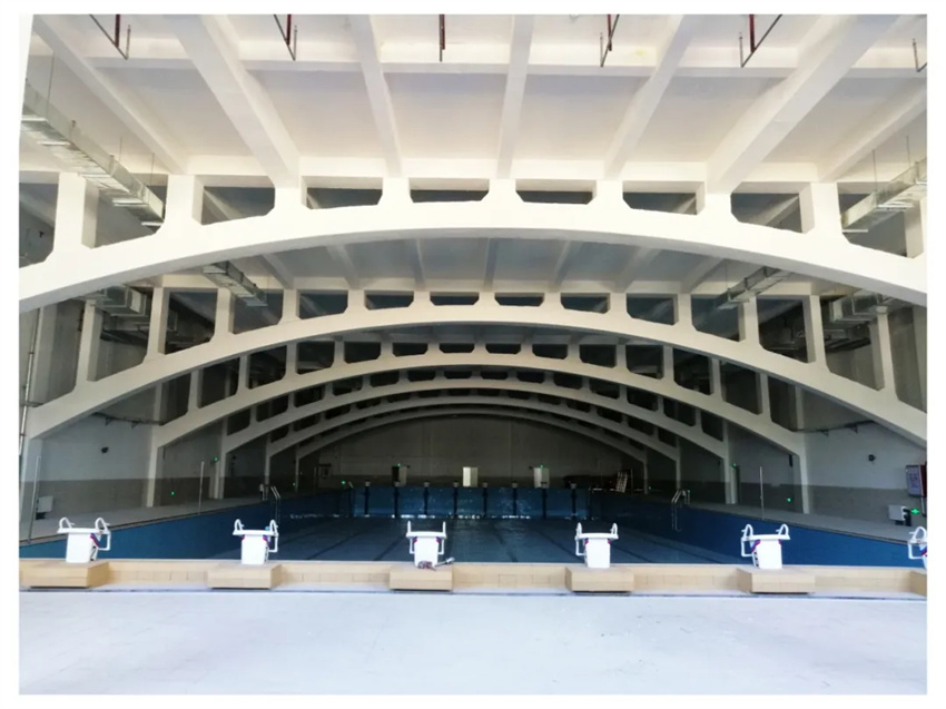 因為空腹拱架梁通透性好,一榀榀排列過去形成拱廊,韻律感強,且越到中部區(qū)拱架梁所占空間越小,會讓游泳館擁有更豐富、舒適的空間。