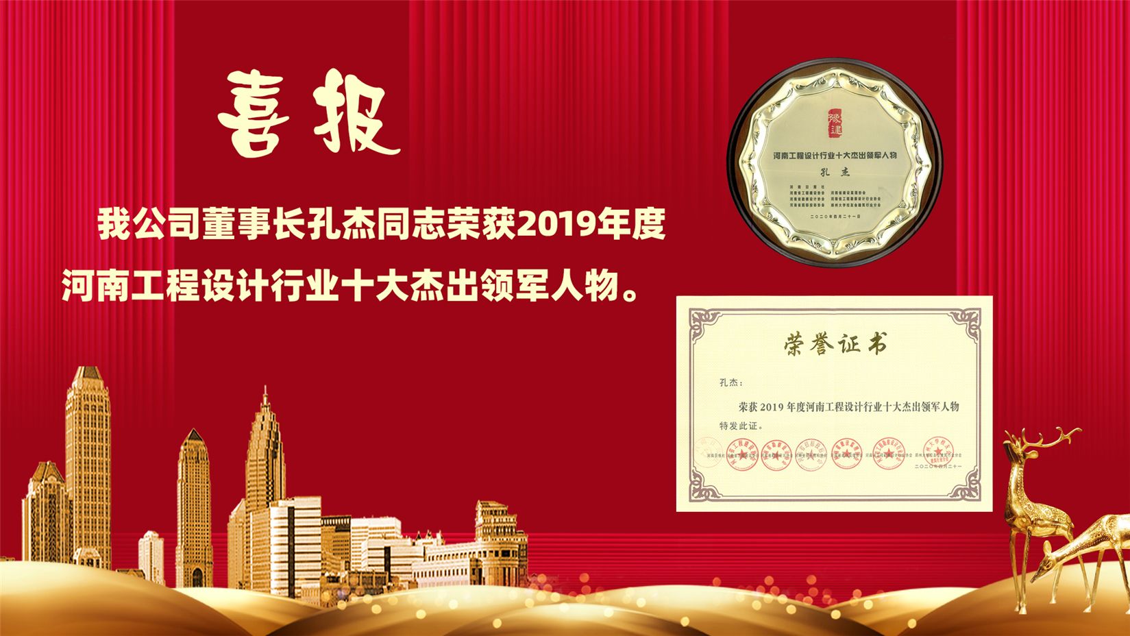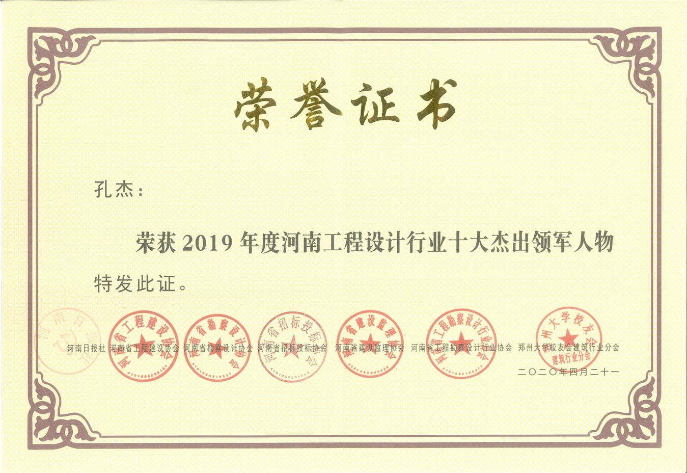 董事長孔杰同志榮獲2019年度河南工程設計行業(yè)十大杰出領軍人物