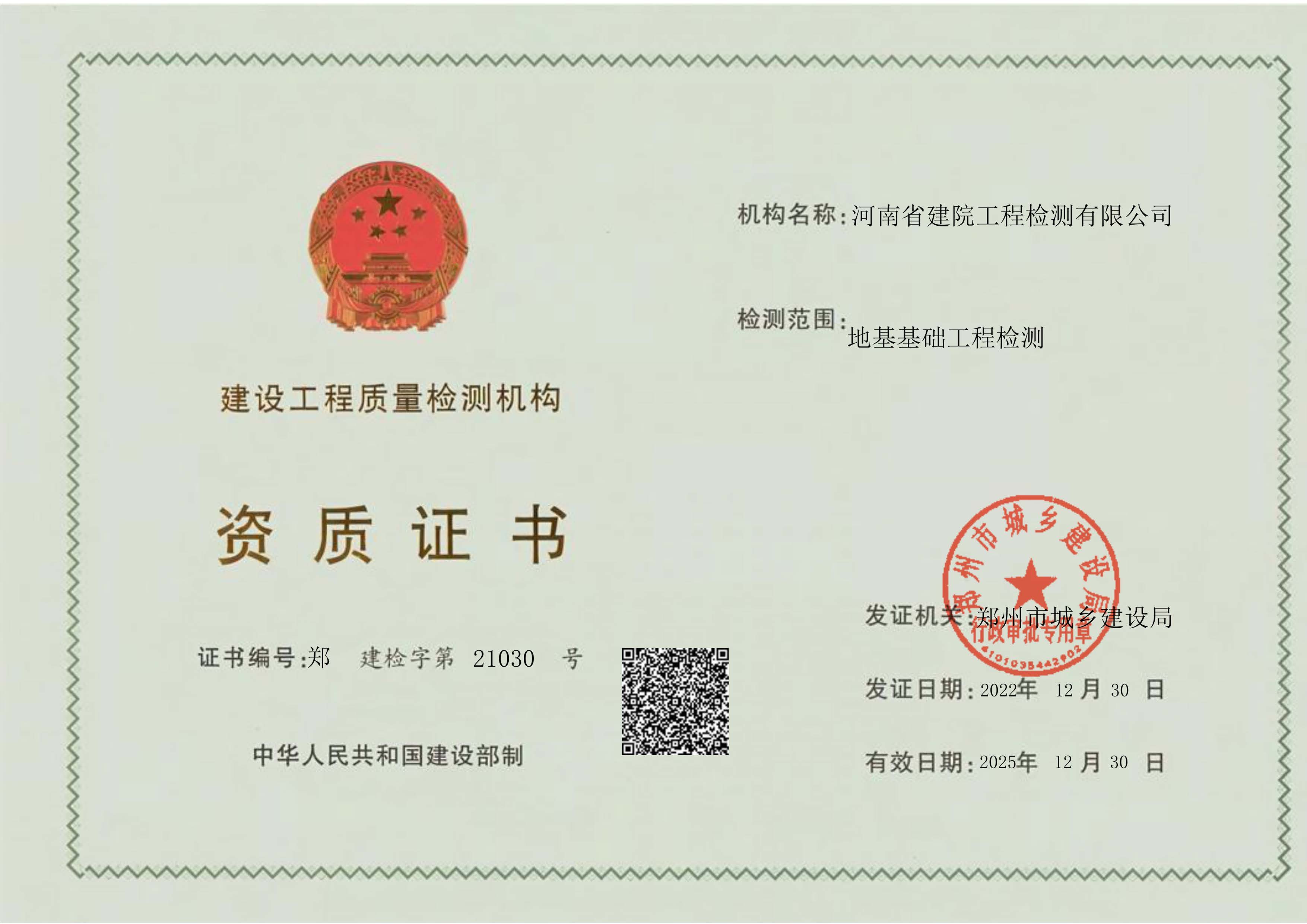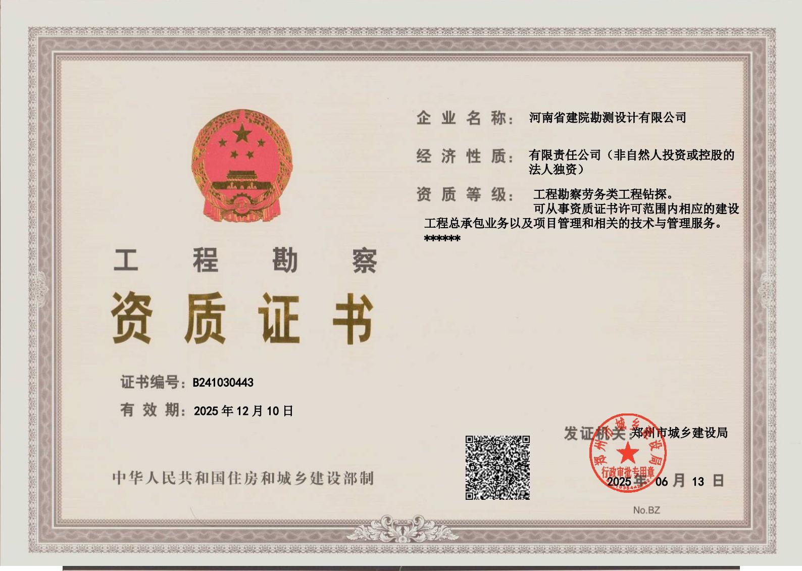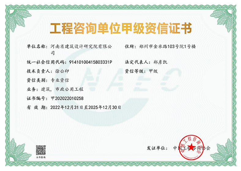 河南省建筑設(shè)計研究院有限公司持有建筑行業(yè)(建筑工程)、市政行業(yè)(道路工程、給水工程)、風(fēng)景園林工程設(shè)計、工程咨詢、造價咨詢、房屋建筑工程監(jiān)理等甲級,市政公用工程監(jiān)理乙級、城鄉(xiāng)規(guī)劃編制甲級、建筑人防乙級、商務(wù)糧乙級,壓力管道設(shè)計等資質(zhì)證書。 河南省建院勘測設(shè)計有限公司持有工程勘察綜合甲級、地基基礎(chǔ)工程專業(yè)承包壹級、乙級測繪等資質(zhì)證書。 河南省建院工程檢測有限公司持有地基基礎(chǔ)工程檢測資質(zhì)證書。 河南省建筑工程施工圖設(shè)計文件審查所有限公司持有施工圖設(shè)計文件審查一類資質(zhì)證書。